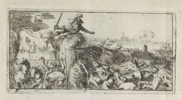 Editor: Here we have an engraving titled "David onthoofdt Goliat," placing us somewhere between 1630 and 1702. The piece is part of the Rijksmuseum's collection and credited to an anonymous artist. The scene, depicted in sharp, precise lines, seems chaotic and dramatic. What do you see in this piece, particularly regarding the way the narrative is presented? Curator: Oh, that slice of savage history served up as art! Well, my eye is drawn to the theatrical flourish. Think about it—here's David, a young sprout, hacking away at the giant Goliath's neck. He's like a zealous gardener pruning a rather oversized, ornately armoured weed! But the anonymous genius who created this...it’s got that whole Baroque drama dialled up to eleven. Everyone is squashed into the picture. Aren't we all in life anyway? You’ve got warring crowds in each corner adding weight and momentum like in the wings of an epic play. Is there anything about the staging that catches your attention? Editor: The crowds definitely amplify the drama. The foreground really highlights David's act, while the armies in the background seem secondary, more like witnesses than participants in this pivotal moment. I think my attention drifts because the landscape flattens in a strange way. It makes the scene seem dreamlike or staged. Curator: Ah, that's clever! It *is* dreamlike! Yes, maybe our engraver isn’t trying to recreate reality with precision, so we shouldn’t try to apply modern expectations to it, perhaps, it is inviting us into this symbolic landscape where ideas are grander and emotions run wilder! Do you get a sense of the artist taking a certain pride in detailing all those teeny tiny soldiers with spears! Almost playful in tone! It almost feels like a satire to some degree! Editor: I see what you mean. Thank you. I guess I hadn't fully appreciated the theatrical element. Now that you’ve mentioned it, that "grandness" helps to appreciate it, and brings another dimension.