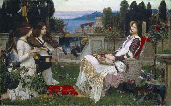 Curator: Here we have "Look any laughs to the plains" by Arnold Böcklin, executed with oil paints and indicative of both Romantic and Symbolist aesthetics. Editor: My immediate reaction is one of cool tranquility, despite the somewhat surreal setting. The color palette is very grounding, focusing on earthy tones and muted light, creating a very quiet moment. Curator: Quiet is a good descriptor. Böcklin’s manipulation of light and shadow, coupled with the composition of figures within a seemingly classical landscape, points to his meticulous layering of meanings and influences. I find myself drawn to the specific material choices in rendering their costumes—what sort of cloth and craftsmanship went into each robe, each corset? Editor: For me, it’s the deliberate juxtaposition of figures that really catches the eye. The singer with the lute evokes a sense of performance, tradition, almost a troubadour-like figure, while the woman reaching toward the flower appears almost ritualistic. Does this connect back to classical mythology? I am reminded of Persephone gathering flowers... Curator: That's certainly possible. Though undated, placing this painting firmly within the late 19th century raises questions. Where exactly was Böcklin sourcing his pigments? Who would have had access to models, such as these figures, for this style of genre painting at that moment in history? Editor: What if the act of picking that flower is symbolic of a fleeting moment of beauty, and an offering? And that grouping—almost a chorus—in the background adds to that feeling of symbolic storytelling... as if the plains laugh on regardless. Curator: Indeed, though to achieve the softness we see here, Böcklin would likely have used blending techniques requiring specific solvents, applicators, and a dedication to slow and careful execution. Editor: Böcklin's careful selection of imagery clearly elevates this into something beyond a simple genre scene, inviting us to explore broader cultural and psychological depths. Curator: Ultimately, the impact is only understood when we ask not just what is represented, but by what means, and under what historical circumstances. The creation itself is as integral to interpretation as are the myths, symbols, or stories hinted within the finished product. Editor: Yes. By acknowledging both the construction and iconography within “Look any laughs to the plains,” we gain a greater insight into Böcklin’s perspective, making it a far more intimate, albeit complex, encounter.