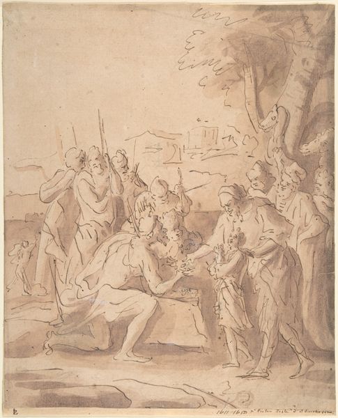 Editor: We're looking at "The Stoning of Saint Stephen," a drawing created around 1610 by Hans Freyberger, using pen, tempera and watercolor. The composition is very active, quite violent even. What symbolic weight do you see in an image like this? Curator: The violence is palpable, isn't it? The stones are obvious instruments, but consider their ancient resonance: they signify not just punishment, but also a return to a primal, pre-social form of justice. It speaks of an erasure of established order, of descending into chaos fueled by rage. How does this echo in contemporary culture? Editor: Well, you often see similar dynamics in depictions of mob violence or political upheaval... I suppose the imagery is eternally relevant in some ways? Curator: Precisely. Stephen, though central, becomes almost secondary in the maelstrom. Note the calm, seated figures on the right—perhaps the witnesses, perhaps even sanctioning the act? Are they the embodiment of societal approval, which gives permission to the act? The building is almost an out-of-focus object ––an afterthought ––representing society itself in that context. Editor: That's chilling. The blurring emphasizes their distance. I hadn't considered the bystanders' passivity as an active element. Curator: Freyberger, whether consciously or not, captured something deeply embedded in the human psyche. The ease with which order can descend into violent ritual, the disturbing comfort in shared aggression... symbols that, once recognized, can illuminate darker aspects of cultural memory. Notice the recurring motifs… Editor: It's like the visual symbols act almost as a shorthand to emotions that can be immediately transferred throughout generations. Thanks, I'll never look at another history painting the same way. Curator: That's the beauty of unlocking these visual lexicons! History paintings can give visual access into how social meaning systems develop through representation, not in reality itself.