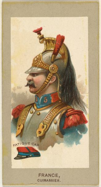 Curator: We're looking at "Fatigue Cap, Ulan, Germany," a print from 1881, part of the "Military Uniforms" series issued by Abdul Cigarettes, currently held at the Metropolitan Museum of Art. It features a portrait of a soldier. Editor: It has a kind of faded elegance, a quiet sort of authority emanating from the subject. I find the composition itself striking— the stark lines and color palette of pale yellows, blues and grays against the grey card feel so purposeful. Curator: Notice the precise delineation of forms, the use of coloured pencil to capture the details of the uniform – the buttons, the trim, even the elaborate headgear with its decorative plume. The artist focuses our attention through this acute detailing of military paraphernalia. Editor: Right, and placing it within the context of Abdul Cigarettes highlights a fascinating intersection between militarism, consumer culture, and visual representation. Tobacco companies often used imagery associated with power and prestige to sell their products, subtly linking smoking to notions of masculinity, empire, and even rebellion. Curator: An interesting socio-political reading indeed. What strikes me is the way the portrait reduces the figure to pattern, emphasizing geometric and symmetrical organization. We're left contemplating how flat shapes interrelate and resolve in space through strategic line. Editor: I think the figure’s somewhat exaggerated features hint at the broader cultural anxieties simmering beneath the surface during that era. There's a potential for reading the artwork as a subtle form of caricature that indirectly critiqued Prussian militarism or its impacts upon the citizenry, by reducing it all to commodity fetish. Curator: Perhaps, but that argument hinges heavily on speculative interpretations. Viewing this primarily through a formal lens reveals a captivating study in form and color, where subject matter is only the facilitator, secondary to line and compositional values. Editor: True, we should resist the urge to make overly simplified conclusions. I see the effectiveness of that more elemental study, but feel this cultural framing illuminates important questions regarding representation and cultural attitudes towards the military during this historical period. Curator: I suppose that dialectic offers each of us distinctive insight, as you reveal cultural tension through historical reading, while I focus instead on its aesthetic properties as its essential merit. Editor: I think we both bring crucial dimensions of art into focus. By bringing to light both cultural tensions of history, alongside formal, geometric beauty, we appreciate its intricate layers and impact, no?