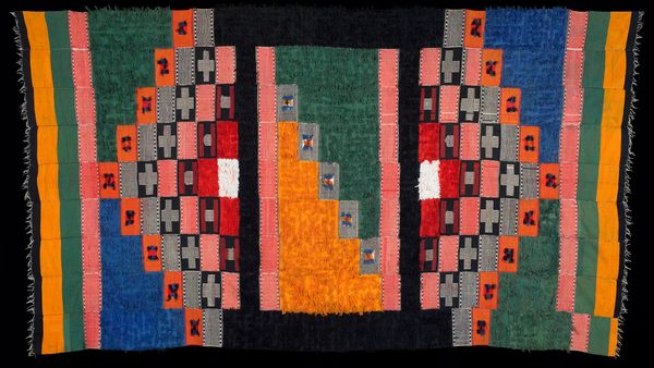 Curator: At first glance, this is a dazzling field of color! A feast of gem-like shapes, though with a definite handmade quality. Editor: That’s a wonderful observation. This is a "Camel Bag," woven, likely, sometime in the 19th century. It's held in the collection of the Minneapolis Institute of Art, and crafted with wool using weaving techniques. Curator: The use of repeating geometric patterns strikes me as culturally significant. Given its context as Islamic art, these designs likely aren't arbitrary. There's meaning encoded within those diamonds and stepped motifs. Editor: Absolutely. The diamond motif, repeated across the face, signifies different things depending on cultural context. We have to think about the anonymous artist's intentions as part of a greater whole. Perhaps it served as protection on arduous travels across social and political borders. Curator: That aligns with what I understand; such symbols resonate, traveling and accumulating different associations. These objects transcend mere function; they serve as emblems. Do you see these inner shapes nested within the larger forms almost like echoing voices? Editor: I see those echos. They feel intimate, perhaps suggestive of familial bonds across generations connected through craft. Also consider how often such pieces are made by women. The practice links artistic creation with gendered labor and historical narrative. Curator: You're guiding us to a nuanced level. How might its function intersect with ideas about mobility? I wonder how heavy it got carrying all this luggage? Editor: Certainly the physical reality affects the communities along the routes. Nomadic identity challenges sedentary norms while trade and cultural exchange occurs within constraints influenced by gendered labor roles. What about the bag itself? It would function in society as a mobile piece of heritage. Curator: In its geometric organization, the weave presents visual reminders; echoes of identity and place. Editor: Ultimately, that's the power of this "Camel Bag," a portable manifesto showcasing individual talent intersecting broader historical, social realities experienced at one time. I see art intersecting community across time, echoing themes to a different place and audience now.