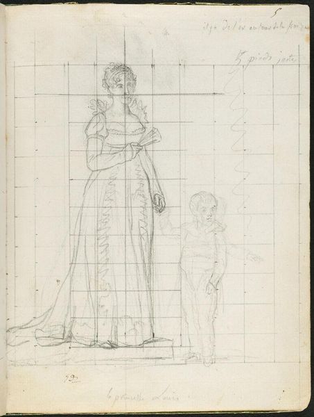 Editor: This sketch by Jacques-Louis David depicts Caroline Bonaparte, the Princess Murat, and Pauline Bonaparte, the Princess Borghese. It's interesting how the figures are positioned within a grid. What stands out to you about the composition? Curator: The underlying grid provides a structural scaffolding, a rigorous armature upon which David constructs his figural study. Observe how the vertical lines emphasize the columnar aspect of their Neoclassical gowns, while the subtle variations in line weight suggest depth. Do you notice the interplay between the geometric precision of the grid and the organic forms of the figures? Editor: Yes, the contrast is quite striking. I see how the grid emphasizes the curves and folds of their dresses. Thanks for pointing that out! Curator: Indeed. It is through such formal contrasts that David establishes a visual dialogue, a tension between order and fluidity. This sketch offers a glimpse into his artistic process, revealing how he manipulates line and form to achieve a desired effect.