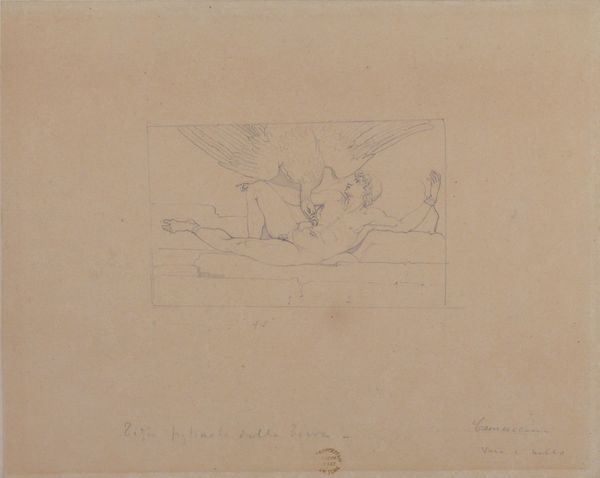 Vincenzo Camuccini made this drawing, Prometheus (or Tityus), with a pen and brown ink on paper. In the 18th and 19th centuries, artists mined classical mythology, like this scene, for its store of dramatic narratives, often emphasizing the body in extreme states. Here, we see either Prometheus or Tityus, both figures known for their defiance of the gods, and punished by being chained down while a bird perpetually devours their liver. Look closely at the exposed body, vulnerable and open to attack. The drama suggests a vision of masculine suffering, yet the scene also evokes themes of power and subjection. Consider the cultural context: this was an era of revolution, where such images could act as metaphors for resistance against tyranny, yet also underscore the painful cost of such rebellion. Camuccini captures a deeply human moment, etched in pain.