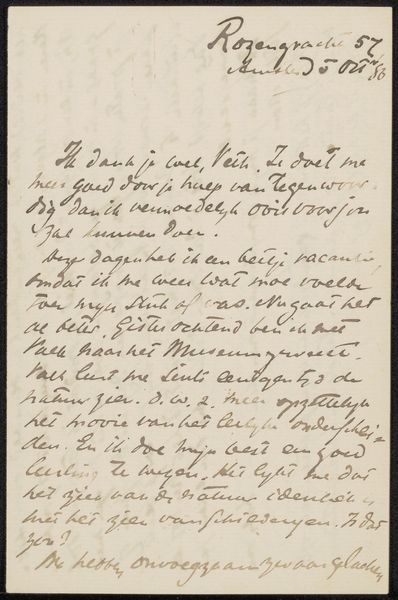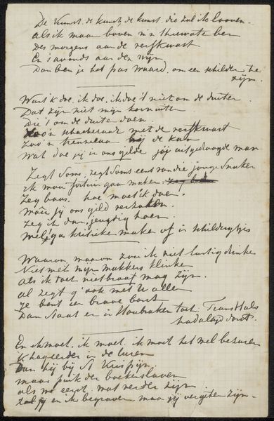 Curator: Let’s have a look at “Conceptbrief aan anoniem” by August Allebé, dated 1848 to 1927. It's a pen and ink drawing on paper currently residing at the Rijksmuseum. My first thought—it looks dense and full of urgency. Like I should know what it says immediately! Editor: It does have that effect. Thinking about the materials and the process here—the directness of ink on paper. No sketches, no underdrawing visible, just the raw inscription. I wonder, what dictated the use of such immediate, arguably ‘cheaper’, materials, and to whom was this work directed? What impact did that choice of media have? Curator: An interesting point. Considering the social context, it's a letter – seemingly a concept for something else, hence the title. The calligraphy itself adds to the piece's expressiveness; it feels personal and spontaneous. Editor: Agreed. It’s interesting to think of this piece’s journey from Allebé’s hand to the walls of the Rijksmuseum. It's easy to assume that it became a celebrated artwork to be showcased and viewed; however, how has its reception changed depending on socio-political environments? Was the 'concept' realized in the end? And would it change my perspective towards this letter, knowing that the sender's concepts became influential in his time period? Curator: I suppose that’s a central element. In regards to context, it really invites us to imagine the original intent behind this piece—was it a draft, or a finished presentation of an idea? Understanding that production element surely does encourage deeper engagement. The materiality of the ink and paper then also speaks to the accessibility, perhaps, of creative expression during this period. It's interesting to see this level of personal exchange treated with such artistic attention. Editor: Absolutely. Displaying private communication for public viewing fundamentally alters our understanding. By placing it within the museum's frame, the institution asks us to consider the artwork not just for its aesthetic qualities, but as a historical object shaped by personal, social, and even political considerations. It allows a layered interrogation that moves beyond simply appreciating Allebé's technique, prompting questions about accessibility and public influence. Curator: Well, thinking about the social context helps enrich the viewing, I find it to be almost as revealing as the inscription itself. Editor: Agreed. There's an intriguing dynamic between personal expression and historical artifact.