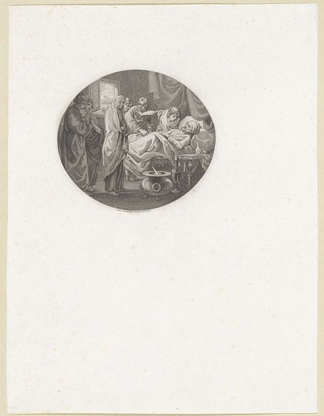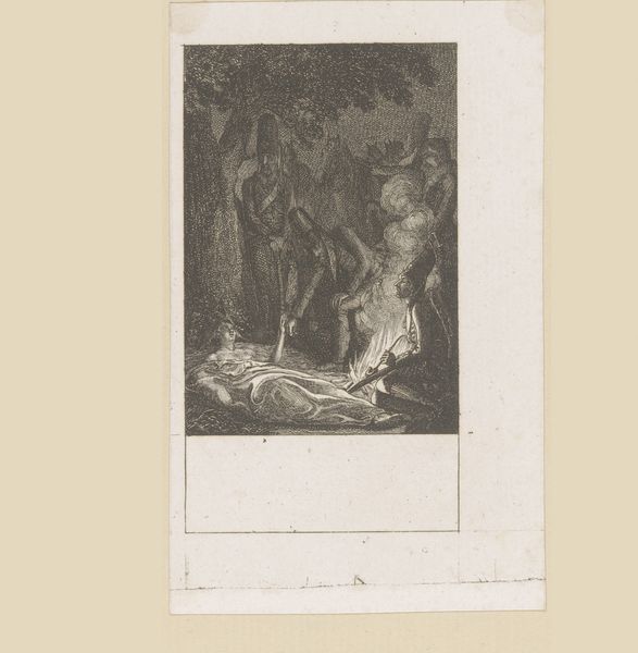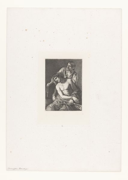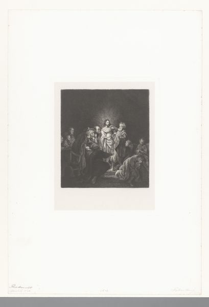Editor: This is "The Denial of Peter" by Nikolay Semyonovich Mosolov. It’s an etching, so it's print on paper, and it appears to have been made sometime between 1857 and 1914. The chiaroscuro is really striking! What do you see in this print? Curator: As a materialist, I'm immediately drawn to the etching process itself. Think about the labor involved: the artist carefully incising lines into a metal plate, using acid to further erode those lines, and then the repetitive act of inking and printing. Each print becomes an indexical trace of that labor. Editor: So, you're saying it's not just about the religious subject matter? Curator: Not just. The subject, of course, speaks to themes of faith, doubt, and societal pressure. But consider the paper itself: Where did it come from? Who produced it? The act of reproducing this image democratizes it, allowing it to reach a wider audience, a departure from unique, privileged paintings. The materiality allows the many, the story itself is then re-consumed in a different light. Editor: That’s a great point! So, the availability of the print transforms the narrative’s accessibility, creating this kind of democratized interpretation of the biblical passage? Curator: Precisely! Consider the socio-economic context in which these prints were circulated. Were they commissioned? How were they priced? These material considerations open up new avenues for understanding the artwork’s function and reception within its time. The print participates within the network of social relations that produced and consumed it. Editor: It's interesting to consider beyond the aesthetic representation! This way of thinking really broadens my view on how we understand a work. Curator: Indeed, it compels us to see beyond the surface image and delve into the very fabric of its making.