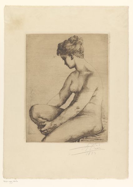 Herman Lowenstam made this study of a child’s nude torso from life, in 1889, using etching and engraving. Take a close look, and you'll see that the tonal range is achieved through an intricate network of fine lines. The engraver uses a tool called a burin to manually cut lines into a metal plate. Ink is then applied to the plate, and then wiped clean from the surface, remaining only in the incised lines. Finally, the plate is pressed onto paper, transferring the image. Etching, which seems to be used here for the broader areas of tone, involves drawing with a needle on a wax ground laid over a metal plate, which is then exposed to acid. The engraver’s skill is paramount: each line must be precise, dictating the image’s texture and form. The controlled, meticulous labour involved in the production process is at odds with the softness of the young skin rendered. This contrast highlights how the value of prints lies not only in their aesthetic qualities, but also in the labour and skill embedded within the work.