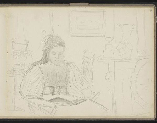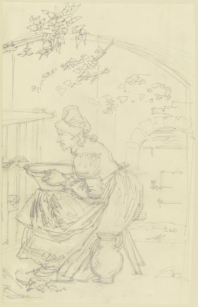 Curator: This drawing, titled "Handwerkende vrouw bij een schoorsteenmantel," or "Craftswoman by a Mantelpiece," was created around 1903-1904 by Carel Adolph Lion Cachet. It is currently held in the collection of the Rijksmuseum. What strikes you most about it? Editor: Its quietness. The delicate pencil lines give it a subdued, almost reverent, quality, like we're peeking into a very private moment. Is that privacy available to all or reflective of its time? Curator: Interesting observation. I see the compositional elements first – the fragmented studies, almost like a page from a design manual. Note the artist's focus: architectural details, furniture elements, interspersed with figure studies. It's an intriguing exploration of form and line. Editor: And what about the "craftswoman?" There's an argument to be made for considering this image in relation to the burgeoning labor movements of the early 20th century. Does it sentimentalize or romanticize working-class women or is she a sign of new visibility and opportunities for them at this time? Curator: While the political and social context certainly frames our understanding, I'm drawn to the artistry. The delicate shading, the precision of the architectural rendering – it's all about the artist's skillful control of the medium. Editor: Yet that medium—pencil on paper—and the unfinished nature of the sketch are integral to its impact. It evokes a sense of process, the fleeting nature of a moment observed and captured, suggesting her opportunities will similarly fade in a sketch. Curator: A valid point, and to be sure, its unfinished nature allows us access to the artist's thinking, their methods. Editor: Which makes the image of this artisan or the thought of working life perhaps the primary, driving focus. Curator: Perhaps. However, what endures is the strength of the composition and the artist's virtuosity, how well the sketch’s formal devices function independently of its era, culture or narrative. Editor: I appreciate the artistry while thinking about how her representation fits within the cultural narrative of women's work at the time. It gives the picture both power and specificity.
