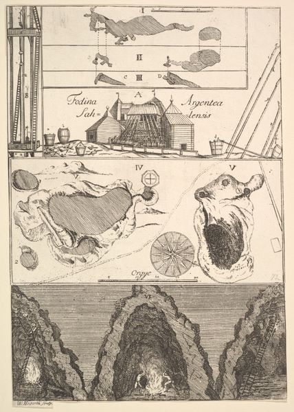This print, titled "Gebruik van de halve cirkel geïllustreerd," was made by Sébastien Leclerc I sometime in the 17th or early 18th century. It's an etching, meaning that the design was first incised into a metal plate, likely copper, and then printed onto paper. The sharpness of the lines suggests that Leclerc may have used a tool called a burin to cut the image, allowing for precise and detailed work. The print illustrates the use of a semicircle instrument, likely for surveying or measuring distances. The process involves careful calculation and application of geometric principles to determine inaccessible distances. The print is fascinating because it's where art meets science and craft. Leclerc's work showcases the essential connection between artistic skill, technical knowledge, and the practical application of mathematical concepts in the early modern period. It blurs the lines between art, craft, and scientific illustration.