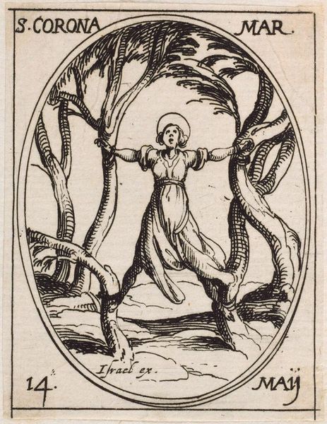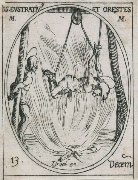 Curator: This is Jacques Callot’s small yet impactful engraving, "Saints Placidus and Flavia". Editor: Striking! The stark contrasts immediately evoke a sense of brutality and suffering. Curator: Indeed. Callot masterfully uses line to create depth and texture in this miniature scene of martyrdom. Note the composition, the oval frame containing a complex narrative. Editor: The gendered violence is impossible to ignore. We see Placidus hung upside down, while Flavia stands passively, bound to an anchor, awaiting her fate. It speaks volumes about power dynamics. Curator: The dynamism of the lines directs our gaze, emphasizing the grotesque detail of Placidus's dangling form and the serene resignation in Flavia’s posture. Editor: Right, and it is hard not to consider how this imagery reflects the religious and political turmoil of Callot’s time. The representation of martyrdom as a spectacle is itself a commentary. Curator: A potent reminder that even within formal constraints, art can resonate with profound historical and emotional weight. Editor: Absolutely. Analyzing the composition deepens our understanding of the intersecting oppressions depicted.