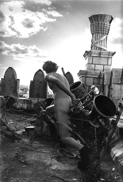 This untitled photograph was made by Arsen Savadov. It's a black and white image, which gives it an otherworldly quality, and I can't help but wonder about the process that went into it. The composition is wild. There are naked folks with their backs to us, instruments everywhere, and an odd-looking architectural structure in the background. It’s the kind of scene that makes you tilt your head and ask, "What is going on here?" The absence of color throws the textures into high relief. The rough, pock-marked surfaces of the instruments contrast with the smooth skin of the figures. I keep coming back to how the instruments, which are meant to create sound and harmony, are kind of awkwardly, almost violently, attached to these bodies. There's an absurd, unsettling quality to the scene. It’s like a Dadaist parade that somehow got lost in the apocalypse. I'm put in mind of Goya. The black and white, the grotesque elements...it's as if Savadov wanted to present the absurdity of the human condition. And in art, uncertainty is often the most interesting place to be.