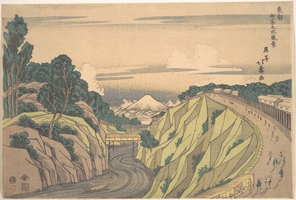Fukuda Bisen made this woodblock print titled 'Het Blauwe rivier deel,' sometime between the late 19th and early 20th century. The palette is soft and watery, mostly blues and greens, with some creamy whites floating in between. It's interesting how he's built up the image through these layered, transparent blocks of color. Look at the mountains in the background, how the blues fade into the distance. It reminds me of how in painting, it’s so much about the doing, the layering, the accidents, all those small decisions that add up. There's a real sense of depth and atmosphere that comes from the physicality of the medium. The way he’s carved the blocks to create these textures, it’s almost like he’s sculpting the landscape. In the bottom corner, notice that jaggedy headland with the town nestled at its base, it looks like the buildings are part of the rock itself. He invites us to see the landscape as not just something to look at, but something to wander around in, and get lost in. Reminds me a little of Hiroshige, but with a bit more…dreaminess. Art is always a conversation, right? A back and forth across time.