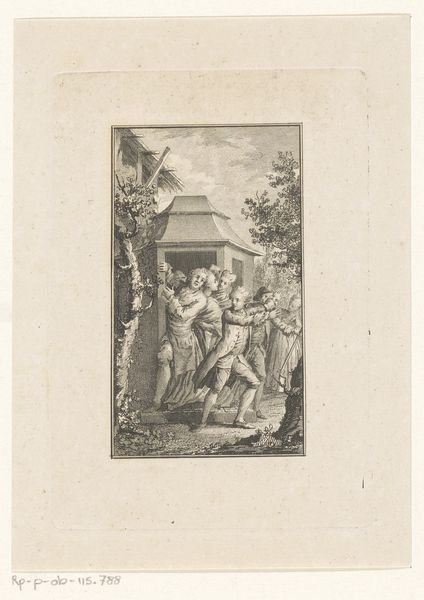 This is an engraving of an Elegant Couple in a Garden, made by Louis Michel Halbou in the late 18th century. The image presents an idealized vision of aristocratic life, likely intended for private consumption. Here, the visual codes of elegance speak volumes about social status. The couple's refined attire, leisurely setting, and the architecture of the mansion in the background all serve to reinforce notions of privilege. Made in France, this work reflects the cultural values of the time. The engraving medium itself is significant. The print market flourished in 18th century Europe, democratizing access to art, albeit primarily among the middle and upper classes. Engravings allowed for the wide distribution of images, playing a vital role in shaping public taste and disseminating cultural values. Understanding this work fully requires historical context and an examination of period documents, such as fashion plates and social commentaries. Only then can we fully grasp the social conditions that shaped its production and reception.