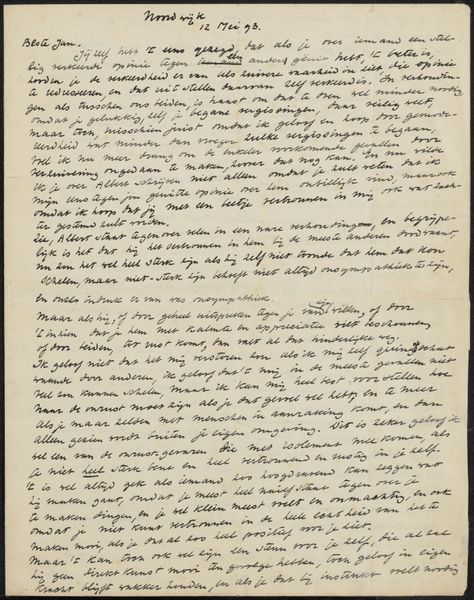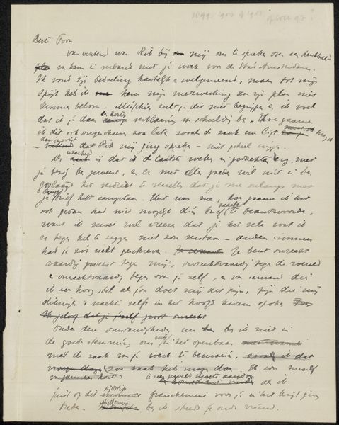 Curator: This is "Brief aan Ina van Eibergen Santhagens-Waller" a mixed media piece, blending drawing, photography and ink on paper by Richard Nicolaüs Roland Holst, dating somewhere between 1878 and 1938. Editor: It feels intimate. Like catching a glimpse into someone's private thoughts. The handwritten text really pulls you in, even if you can’t read it. The overlapping X marks gives the sense of being cancelled, forbidden. Curator: Holst was deeply involved in the cultural and political circles of his time. This letter provides a snapshot of his correspondence and personal network. Its presence in a museum highlights the enduring fascination with artists’ lives. Editor: The very act of using ink on paper anchors this work to a specific time and place. We know it wasn't typed. It's a physical artifact shaped by his hand and the materials at his disposal. It underscores how writing and making inform thought, shaping its direction and flow. Curator: Exactly. Holst wasn't only an artist; he was also a theorist and writer, which adds another layer. He actively participated in debates about art’s function in society. Perhaps the act of writing *was* his medium here, expressing concepts and theories on a raw, personal level. Editor: I’m drawn to that "cancelled" sensation made by that big cross. It suggests an ambivalence, like the ideas expressed in the letter couldn't stand, were rejected for whatever reason. Holst perhaps challenged prevailing attitudes about artmaking, something he might express clearly in his letter and cross out reflexively. It makes you question art’s role, literally overwriting past visions, pointing to newer perspectives. Curator: Absolutely. Looking at it today, it invites us to reflect on the personal and public dialogues shaping artistic movements, then and now. It really exemplifies modernism as an approach. Editor: Indeed, considering the labor inherent in letter-writing alongside Holst’s apparent struggles with what he’s writing deepens my understanding of art’s messy development. It makes the final works—the sculptures and paintings—all the more meaningful, born out of so many moments of wrestling and refining on paper.
