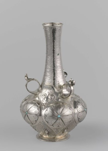 Curator: Here we have a silver bell, dating back to the 18th century, created by the silversmith James Gould. It's located at the Harvard Art Museums. Editor: The first thing that strikes me is the intricate detail, especially the lattice pattern on the handle and those swirling monograms. It speaks of a very particular kind of labor. Curator: Indeed. Gould was part of a network of artisans catering to a growing merchant class. These objects were not just functional, but markers of status, emblems of colonial aspiration. Editor: Absolutely. And the bell itself represents a form of control. Who was being summoned? Who was doing the ringing? The material belies a power dynamic. Curator: Precisely. Its display today raises interesting questions about the legacy of wealth and labor embedded within our cultural institutions. Editor: It encourages us to consider the unseen hands that shaped its creation and purpose. Curator: A small object with a big story. Editor: Definitely something to reflect on as we move on.