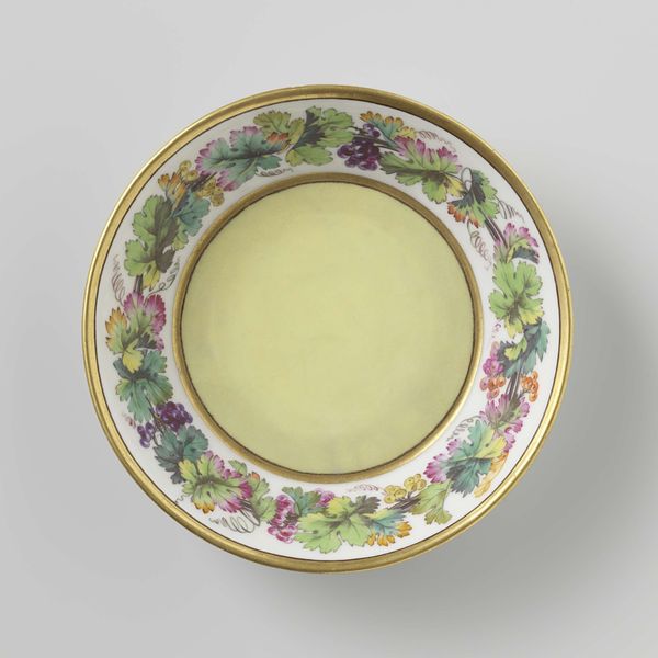 Editor: Here we have an oval dish, crafted from Spode creamware, dating back to around 1790 to 1820. The delicate ceramic seems so simple, but something about the piercing in the rim is really appealing. What stands out to you about the form of this piece? Curator: The plate exemplifies neoclassicism through its symmetrical arrangement and refined materiality. Notice how the central void compels one's focus on the geometric relationships between the concentric bands. The use of a cool blue outline serves as a visual delimiter and contributes to the plate's structured composition. Observe the repetitive pierced openings on the outer rim; the alternation between solid and void provides rhythmic articulation to the overall shape. Do you see how the colour scheme reinforces that geometric intent? Editor: I hadn’t thought about the way the colours reinforce that structured element. The pattern almost looks machine-made! Curator: Precisely. It represents an exploration of controlled form, in part inspired by ancient archetypes, mediated via advanced ceramic technology. One might decode it as the superimposition of orthogonal and circular design principles, with subtle, almost mathematical precision. Editor: So the technology informed the art itself! It makes me appreciate how carefully considered the design is, despite looking like a functional object. I initially missed a lot of these complex elements of geometric composition. Curator: By recognizing structure, repetition and colour theory we unveil levels of intent—how art and technology were mutually informing each other.