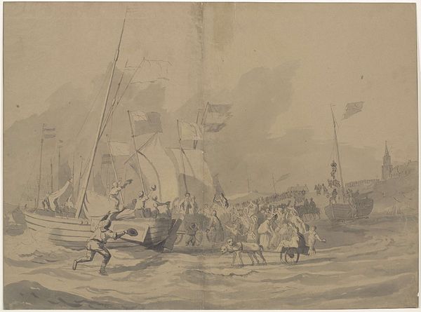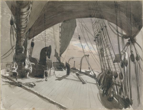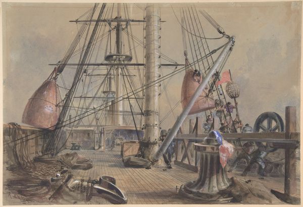 Editor: We're looking at "The Picking-up Machinery in the Bows of the Great Eastern" by Robert Charles Dudley, made between 1865 and 1866 using watercolor and other media. The composition, with the machinery in the foreground and the receding deck, makes me feel like I'm right there on that ship. What are your thoughts on the painting? Curator: The formal elements here are compelling. Note the stark contrast between the delicate watercolor washes and the precisely rendered machinery. How does the artist’s manipulation of light and shadow across the deck affect your reading of the scene? Editor: The light definitely guides my eye towards the activity further down the deck, highlighting the machinery and men working. Is there any symbolism at play, contrasting the human element against the machinery? Curator: Precisely. The machinery itself, meticulously drawn, can be interpreted as a representation of progress and industrial might. How does the perspective, tilting slightly upwards, influence your impression of this machinery? Editor: It emphasizes the imposing size of the ship and its equipment, almost dwarfing the figures on deck. The angle makes it seem larger than life. Curator: Indeed. The composition also directs our gaze towards the sky, perhaps suggesting aspiration or the sublime. Notice how Dudley juxtaposes the geometric rigor of the ship with the relative softness of the sky and sea. What feelings does this duality evoke? Editor: It creates a tension between the man-made and the natural world, like this ship is attempting to master its environment. I hadn’t considered that contrast until now! Curator: Observing these contrasting elements brings the artwork to life. I leave with a refreshed perception of pictorial space through Dudley's orchestration. Editor: Absolutely! Focusing on form opened a whole new avenue of appreciating the artist’s perspective.