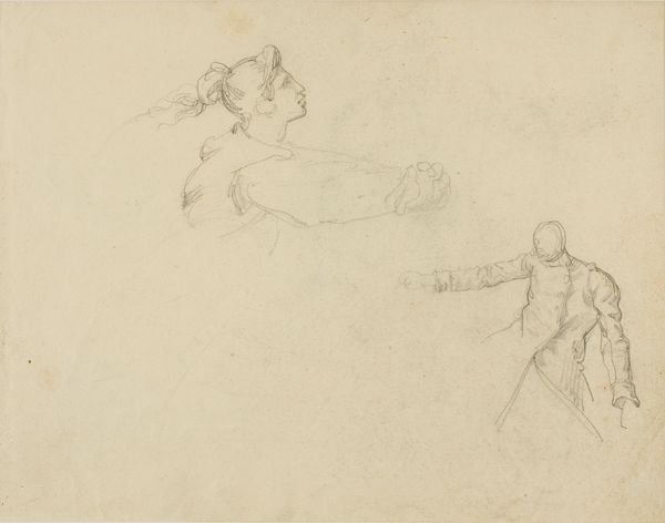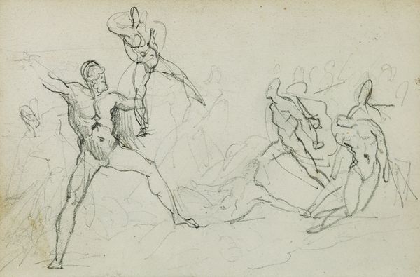 Editor: So, this is "Gevecht tussen een soldaat met een zwaard en twee mannen met een bijl en een pijl en boog," which translates to "Fight between a soldier with a sword and two men with an axe and a bow and arrow." It's a pencil drawing by George Hendrik Breitner from 1873, here at the Rijksmuseum. It feels like a snapshot of a larger narrative, full of tension, but also a bit unfinished. What do you see in this piece, and how does it speak to its time? Curator: It's tempting to view this simply as a historical battle scene, but let’s consider the broader socio-political context of 1873. Post-colonial power dynamics were very tense. Is Breitner depicting a straightforward clash, or is he exploring power imbalances, resistance, and the romanticized visions of conflict that served to justify those power imbalances? Editor: I hadn't thought of it that way. The roughness of the sketch makes it seem less about glorifying war and more about the raw struggle. Could that rawness be a critique? Curator: Precisely. Consider how academic painting traditions of the time often presented idealized, heroic depictions of battle. Breitner, in his sketch-like style, departs from that, doesn't he? Could his deliberate lack of polish be a subtle form of resistance against established norms, a commentary on the dehumanizing aspects of conflict masked by grand narratives? Do you find that reading reflected in other works by Breitner? Editor: I need to explore his other work! This makes me question what I initially perceived as simply a historical scene. I thought I was just looking at an old battle drawing. Curator: And now? Editor: Now I'm wondering whose perspective we are actually seeing and how that perspective impacts the meaning of the scene. Thanks for the historical context!