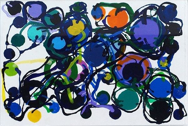 Atsuko Tanaka's 'Work' is a visual explosion rendered with bold, unrestrained energy. The canvas bursts with vibrant hues of red, blue, yellow, green, and pink, forming an exuberant dance of circles and lines. This composition seems to defy conventional structure, yet a closer look reveals a deliberate interplay of form and chaos. The circles, some neatly defined and others dissolving into the background, are interconnected by meandering lines that create a sense of dynamic movement. Tanaka’s approach to form can be seen as a semiotic system of signs, where each color and shape contributes to a complex, interconnected web of meaning. Consider the relationship between the solid blocks of color and the fluid lines, challenging fixed meanings and inviting a re-evaluation of space and perception. This tension between order and chaos underscores a broader artistic concern with challenging traditional artistic norms. Ultimately, the artwork functions as a vibrant exploration of form, not just aesthetically but as a commentary on the cultural and philosophical currents of its time.