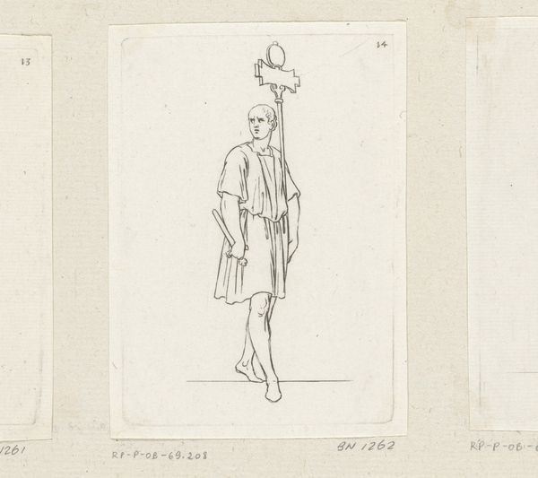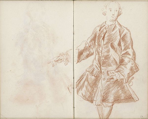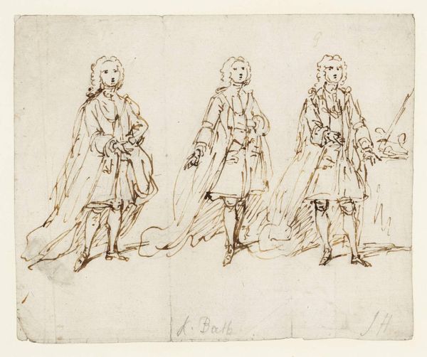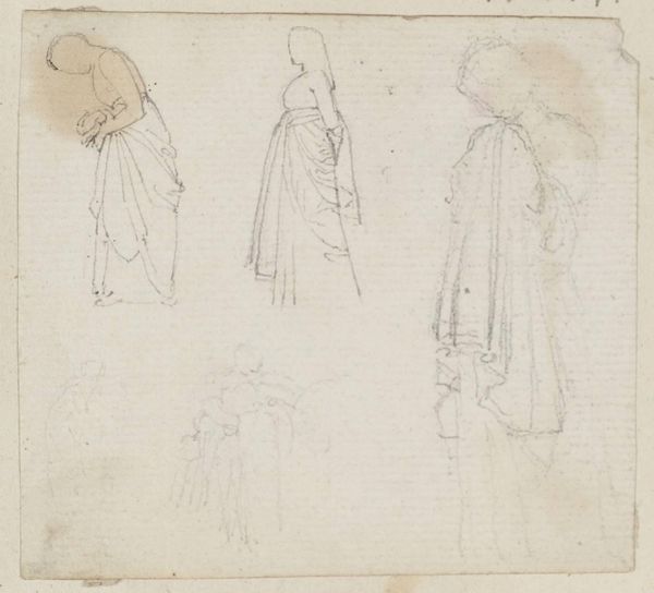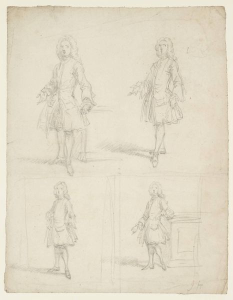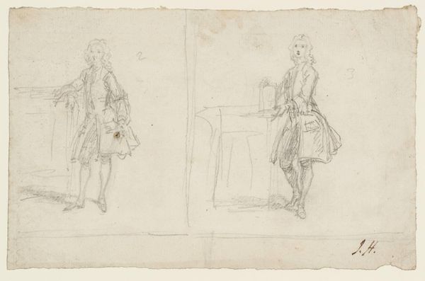 Curator: Here we have Joseph Highmore's "Two Full-length Studies of a Man Leaning on a Cannon," held at the Tate Collections. Editor: It's quite evocative, really—all sketched lines and classical postures. The cannon suggests power, yet the figure seems somewhat nonchalant. Curator: The cannon is central, isn't it? Highmore likely used readily available graphite and paper, making accessible representations of military might and class. Editor: I see the cannon more symbolically. It represents perhaps a transition from old power structures to new social anxieties, reflected in the man's posture. Curator: I'm drawn to the rapid marks used to capture the light glinting off the metal—consider the availability of materials impacting production and reception. Editor: Indeed, but consider also the cannon as a phallic symbol—a Freudian interpretation lends weight to the man’s seeming detachment. Curator: Well, both points shed some light on Highmore's process and the artwork's context. Editor: Agreed. It certainly invites contemplation.
