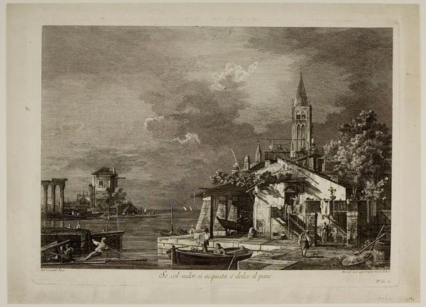 Curator: The interplay of light and shadow immediately strikes me in Michael Angelo Rooker's "North West View of Friar Bacon’s Study." The composition feels carefully balanced, doesn't it? Editor: Balanced, perhaps, but I’m drawn to the social context here. The print medium suggests wider accessibility. Who was consuming these images and what did Friar Bacon represent to them? Was it an antiquarian interest? Curator: The etching technique, with its fine lines and tonal gradations, certainly lends itself to mass production. But I wonder about the aesthetic choices. The artist emphasizes vertical elements to give the composition structure, the tower, the masts, the spire. Editor: The scene feels idyllic, even with the implication of labor in the figures on the boat and the construction along the river. The very act of documenting this place transforms it into a commodity. Curator: True, but the composition creates a sense of depth, with the buildings receding into the distance. It is a delicate balance, isn’t it, between function and form? Editor: Indeed. It invites us to consider the ways landscapes are shaped by both human activity and artistic representation.