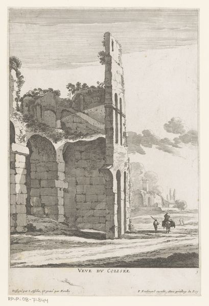 Curator: This is "Two Men Beside the Ruins of a Gate in Rome" an engraving by Johann Franz Ermels, likely created between 1651 and 1693. Editor: There's a certain wistfulness to it. The decay is palpable, but also... picturesque. Like a memento mori viewed through a romantic lens. Curator: Precisely! Ermels has used precise lines to define the textures—stone, foliage, even the clothing of the men. Note how the composition guides our eyes from the foreground figures through the arch and into the distant architecture. Editor: Those figures, though. They seem dwarfed, don't they? And not just by the sheer scale of the ruins, but also by the weight of history, almost disappearing within this image of temporal decay. What does this signify? Curator: The inclusion of figures grounds the fantastical with reality. They allow the viewer a sense of human presence in this ruined landscape, suggesting a meditation on time and its impact on human structures. Editor: What intrigues me is the symbolism within the architecture itself. The arch, now crumbling, speaks of triumphs, once glorious, now turned to dust. Does it invoke the idea of the cyclical nature of civilizations? Or a subtle commentary on imperial hubris? Curator: One could certainly read it that way. However, one may also consider the work an objective study in form and technique. Note the detail given to rendering depth through linear perspective, creating a strong illusionistic space. Editor: The play of light and shadow enhances the mood, imbuing it with drama and depth. Even though it’s an engraving, there is still tonal variety. Curator: That interplay certainly directs our eye. It highlights areas of visual interest, guiding us through the artist’s structured interpretation. It is ultimately the framework that provides symbolic substance to the artist’s architectural subject matter. Editor: For me, the enduring resonance comes from its suggestion that the past, even in its ruined state, shapes our present—if only as a somber reminder of our shared mortality. Curator: Indeed, regardless of interpretative stance, Ermels' work presents both aesthetic beauty and complex ideas that offer enduring insights.