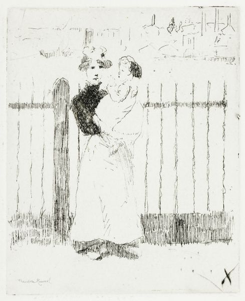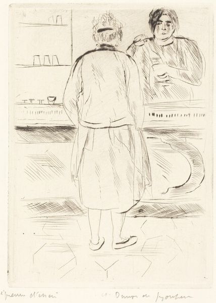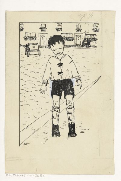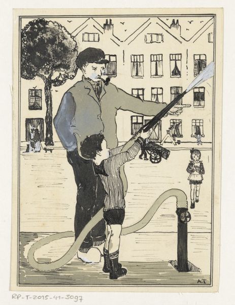 A. Tinbergen created "Boy Waving to a Driver" in pen and ink and watercolour. Look at the scratching and cross-hatching across the boy's jumper – it is a great example of mark making as a process. The pen moves intuitively, as if trying to work out the form as it goes along, like it is feeling its way through the image. The work is all about texture. See how the horizontal lines of the road contrast with the vertical lines of the tram lines. There's a limited palette here – greys, blacks and beiges. The artist leaves areas of the work untouched, so the paper shines through. It's this contrast between the heavy ink and the lightness of touch that makes the piece so interesting. Notice the dog – a few simple marks are enough to bring it to life, its tail wagging with excitement. Looking at this, I am reminded of Philip Guston, but with a lighter touch. It makes you consider how every artist is in conversation with those that have come before.