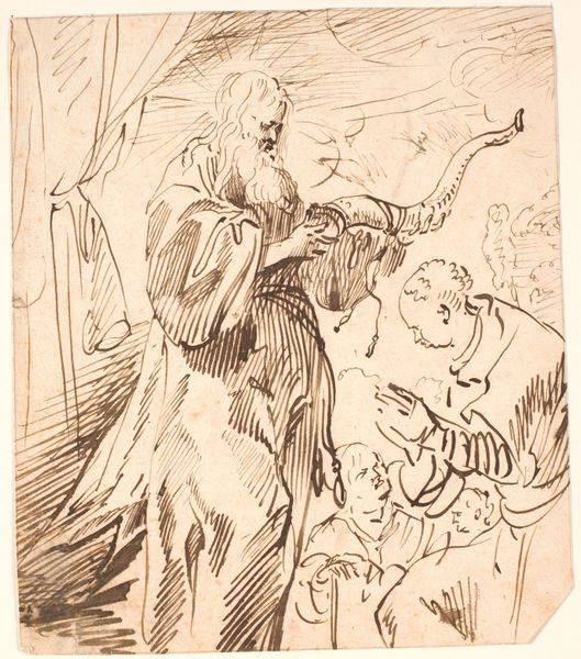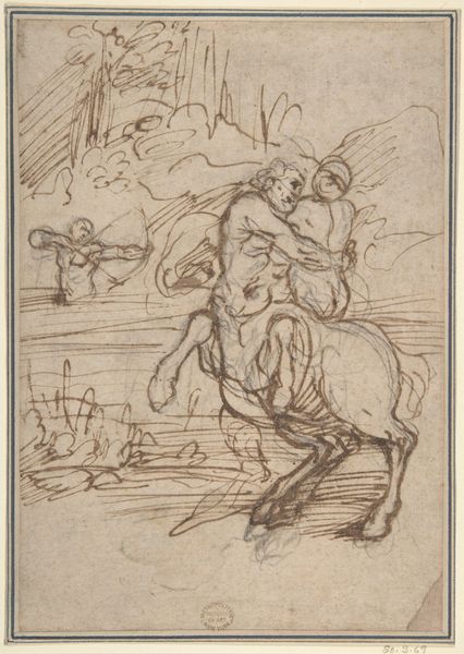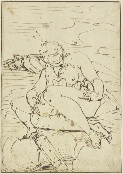 Editor: This ink drawing, "Caritas unter Bäumen sitzend" by Luca Cambiaso, shows a woman surrounded by children. There’s a real sense of movement in the linework, almost frantic, yet the scene feels tender. What stands out to you? Curator: I see a powerful commentary on motherhood and societal expectations. "Caritas," or charity, often depicts idealized generosity. But Cambiaso places it within a specific context, one where the labor of caregiving is highlighted, and maybe even the exhaustion and societal burden that comes with it. How does the composition itself—the way the figures are arranged—speak to these themes? Editor: I see the children clinging to her, and the linework makes it look chaotic, but somehow stable. It gives the impression of constant needs. Curator: Precisely. And where is this Caritas located? "Unter Bäumen," under trees. It's not a grand palace or a church, but a natural, almost humble setting. How does this natural environment, compared to typical Renaissance settings, influence your interpretation? Is it about vulnerability, or a raw, unfiltered truth of existence? Editor: It definitely brings a sense of vulnerability. There’s no protection besides the trees. Maybe Cambiaso is suggesting that charity and care should exist everywhere, not just in formal settings? Curator: Exactly. It raises the question of who bears the responsibility for care. Is it solely the individual, or does society as a whole need to provide a supportive environment? Editor: That's something I hadn't considered before. Looking at it now, it’s much more than just a depiction of motherhood; it’s a statement about social responsibility. Curator: Absolutely, this image reframes a classic motif through a lens that engages with critical issues about support, social structure, gender, and societal expectations that we continue to wrestle with today.