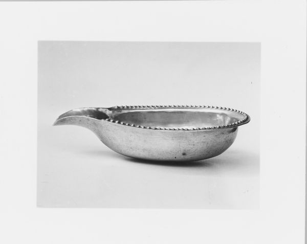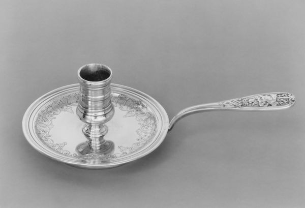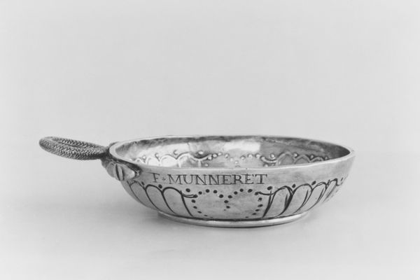 This wine taster was made in France by A.L. sometime between 1750 and 1850 out of silver. Note the craftsmanship evident in its hammered form, the delicate handle cast with classical motifs, and the pierced bowl with precise drainage holes. But the real story here is about value and labor. Silver, a precious metal, signifies wealth, while the decoration adds a bespoke, personal touch. The wine taster wasn't just a tool; it was a status symbol. Think of the specialized skills required: the silversmith's mastery of shaping and joining, the engraver's steady hand. Each stage represents hours of labor, a concentrated effort to transform raw material into a refined object. This piece encapsulates the social hierarchies of its time, where craftsmanship and luxury intertwined to reinforce class distinctions. By understanding the materials and making processes, we see how everyday objects like this wine taster transcend mere functionality, reflecting the intricate relationship between art, craft, and society.