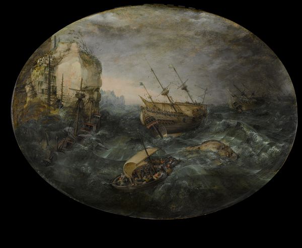 Editor: So, this is "Shipwreck against a Rock," made sometime between 1600 and 1700 by an anonymous artist. It's oil paint on… something! The scene is really chaotic. What’s striking is how the violence of the natural world, the shipwreck, is foregrounded against what looks like a coastline. What do you see in this piece, from your perspective? Curator: It's fascinating how these shipwreck scenes became popular, especially from the Baroque period onwards. It's more than just a dramatic scene; it’s a potent symbol loaded with cultural meaning. Think about the Dutch Golden Age and their maritime power. This painting shows the precariousness of that power. Editor: Precarious, how so? Curator: Well, consider who would be commissioning these pieces. They wouldn't likely be the sailors experiencing this firsthand, but rather the wealthy merchants and elite who profited from sea trade. For them, this shipwreck serves as a constant reminder of the risks involved in their endeavors, but also of the power of nature itself. Does the painting perhaps make you reflect on social hierarchies in place? Editor: Absolutely, there's almost a voyeuristic aspect to it – the painting provides a safe distance from real danger. Viewing such drama provides an experience. Curator: Exactly! The anonymous artist plays on this dynamic. What seemed at first glance like a scene of pure chaos is, in fact, a carefully constructed commentary on the socio-political landscape of the time. Editor: I guess I initially saw only the disaster, but now I see the wealth disparity represented by the chaotic image, made safer by the aesthetic framing! It’s made me rethink how I analyze disaster images. Curator: And that’s the beauty of art history – uncovering those layers of meaning, one brushstroke at a time.