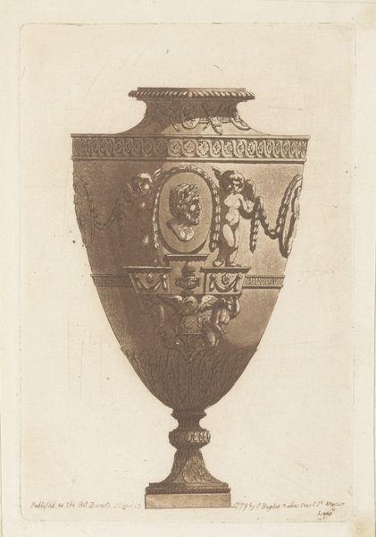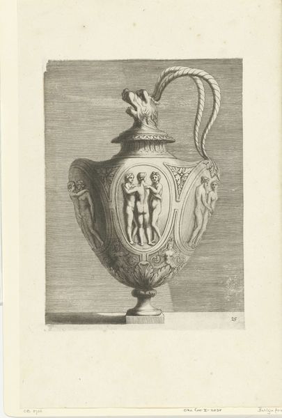 Editor: This is "Urn met twee hoge handvatten," an engraving on metal from 1667 by Françoise Bouzonnet. I'm struck by the formality of it, like a relic of a bygone era, but I'm not quite sure what it’s trying to convey. What do you see in this piece, especially regarding its historical context? Curator: Well, let's think about the Baroque period and its relationship to power, particularly for women. The urn itself, typically associated with funerary rituals or displays of wealth, is here presented as a kind of trophy. Given Bouzonnet's position as a female artist in a male-dominated field, how might the very act of creating this highly ornamental piece be a commentary on gendered expectations around skill and decoration? Notice how the classical figures are almost like prizes displayed around the vessel. Editor: That's interesting! I hadn't considered the piece as a statement on gender. So, the deliberate display of craftsmanship, combined with the classic imagery, could be read as Bouzonnet asserting her skill within those social constraints? Curator: Exactly! And beyond individual skill, it speaks to the broader negotiation many women artists had to undertake. They are expected to conform to norms around skill, and expectations of women to focus on "minor arts," but subtly challenge them by exceeding in traditionally accepted "feminine" art forms, simultaneously celebrating and questioning those limitations. Editor: That changes how I see it entirely. I initially just saw a pretty engraving of a classical urn, but now I recognize it's laden with so much more social commentary. Thanks for pointing that out. Curator: The act of interpreting art becomes about understanding and acknowledging silences and power structures of past times. It gives these artifacts renewed life within present discourses. Editor: I see what you mean. There's real power in reinterpreting historical art through a contemporary lens.