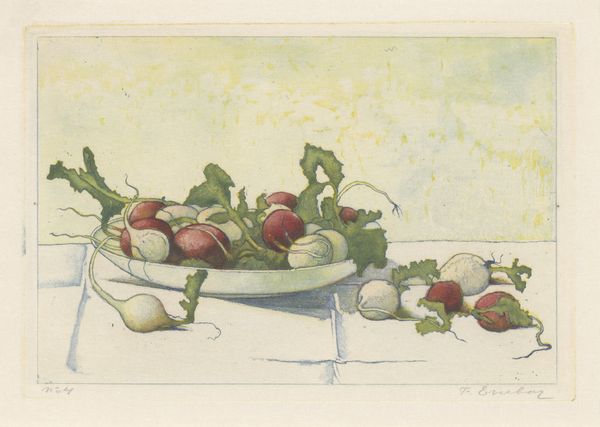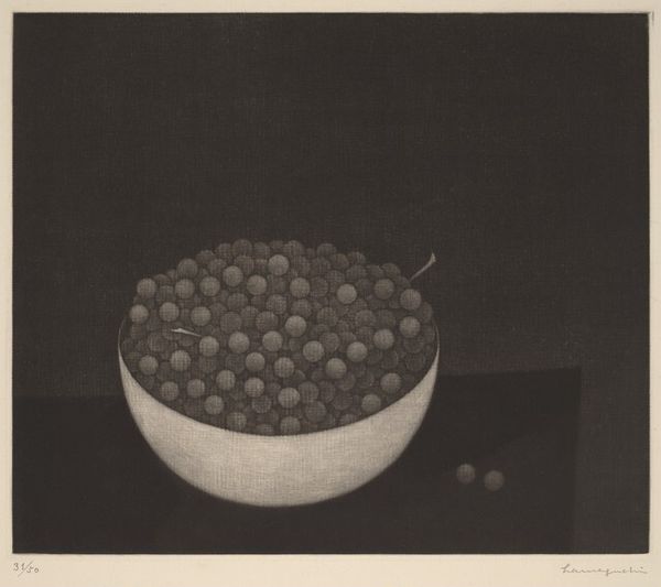 Editor: This is Wayne Thiebaud's "Cherries" from 1984, rendered as a print. It's just a simple bowl of cherries, but there's something so striking about the shadows and the monochrome palette. How do you read into this piece? Curator: It's deceptively simple, isn't it? Those deep shadows create a sort of quiet drama. Thiebaud often focuses on everyday objects, elevating them through meticulous technique. It's realism, yes, but a realism infused with memory, with feeling. Makes you think about what a shadow represents, doesn't it? The past, what's hidden. What would it mean if the work was vibrant in color? Editor: Interesting, I would have thought colour could bring more 'life' to the work. Curator: Maybe...or would it just be a picture of cherries, flat, expected? The monochrome throws us, highlighting form and shadow instead of predictable color. Think of childhood summers, that first taste of sweetness…a tinge of tartness. Does it evoke any memories? Editor: Now that you mention it, my grandmother had a cherry tree, and she used to serve them in a similar bowl... So this simple scene carries a heavy load of nostalgia! It's amazing how a minimalist approach can be so suggestive. Curator: Exactly. Thiebaud understood that power. He gives us just enough to unlock our own stories. What at first seems commonplace becomes deeply personal. Editor: That is such a great perspective. This piece does a great job of showing you that simple is, well, not so simple. Thank you for taking the time to explain! Curator: My pleasure. Always good to be reminded that the everyday, when truly seen, is extraordinary.