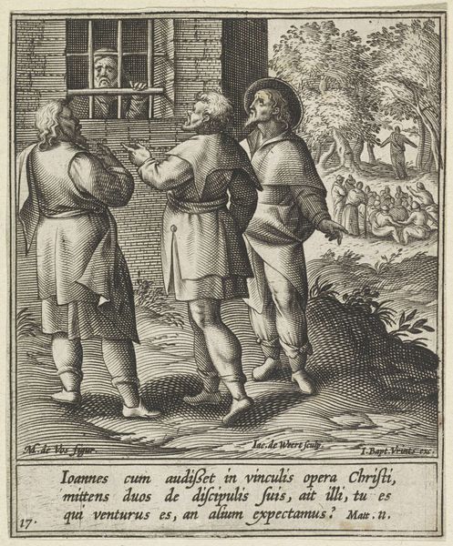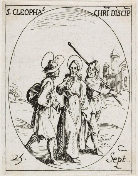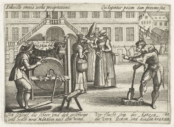 Curator: What a lively scene! Here we have "Verkoper van pannen en sleutels," or "Vendor of Pans and Keys," a print dating from between 1613 and 1667 by an anonymous artist. The etching depicts what appears to be a bustling urban environment. Editor: My eye is immediately drawn to the figures in the foreground – a peddler with his wares. There's almost a comedic energy; the scene seems brimming with everyday life. Curator: Indeed! The figure with the pans slung across his shoulder is key. Think about the cultural significance of the wandering merchant. He’s not just selling wares; he's bringing news, connecting rural and urban communities. These characters embody a specific moment in the developing urban economies of the time. Editor: I'm particularly fascinated by the symbolic weight of those pans and keys. They aren't simply objects for sale; the keys suggest access, secrets, perhaps even freedom or imprisonment. While the pans, symbols of nourishment and domesticity, contrast intriguingly with the more worldly implication of the keys. They speak to fundamental human needs and desires. Curator: Absolutely, and the cityscape provides a crucial context. Etchings like this were vital for disseminating images of city life. The architecture in the background reflects a burgeoning civic identity, but more interestingly we note that in these genre-paintings or landscapes, there were emerging different notions of urban living, who gets included and excluded, as we see through that small window, left to our analysis. Editor: And those figures in the window frame add another layer! Observing, judging perhaps. They represent the social hierarchy inherent in urban environments. They feel trapped and judging, don't you think? Curator: That's an interesting point about the figure trapped in the window frame: perhaps the scene shows the dynamism of economic life in that particular city! The image encapsulates themes of exchange, access, and the multifaceted nature of urban existence. Editor: Considering this work I start thinking about our dependence of material objects and economy even at a deeper phsycological layer. Curator: A stimulating reflection, don't you agree?