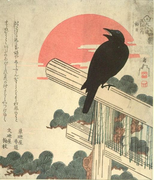Curator: Looking at this woodblock print, dating from around 1868 to 1872 and created by Kawanabe Kyosai, currently held at the Rijksmuseum, the mood is immediately stark and contemplative, isn't it? Editor: Absolutely. The sharp contrast between the black crow and the snowy white branches creates an impactful visual tension. The use of the minimal palette to such dramatic effect really speaks to its elegance. Curator: Crows, especially in Japanese art and folklore, can be powerful symbols. They can represent intelligence, but also trickery or even serve as messengers from the spirit world. This crow, perched so prominently amidst the wintery landscape, seems imbued with a particular significance, doesn’t it? Editor: I agree; it feels very deliberate. From a purely formal perspective, observe how Kyosai balances the composition. The circular impression of the sky mimics and softens the angularity of the pine needles, the crow sitting in stark contrast between the two is a lesson in asymmetry. The flat planes and deliberate outlining give it a sense of immediacy. Curator: The placement within that void and use of white snow creates a sense of purity and quiet observation—almost a meditation on winter's stark beauty but could also symbolize resilience. After all, the crow endures even in the harshest of landscapes. I’m drawn to what this endurances may imply—perhaps the crow is not just surviving but thriving? Editor: I hadn't thought of it in that way. I appreciate that interpretation because in this ukiyo-e style, the reduction of color demands an exceptional clarity of form to evoke that powerful symbolic resonance that you touched upon earlier. The execution makes this print remarkable, transforming a seemingly simple scene into something so complex in both construction and context. Curator: Yes, something as simple as snow falling—and the resilience the landscape inspires—transcends just form. We may leave understanding the world through that lens slightly differently. Editor: Indeed, there's an intensity there. It forces one to reconsider simple binary aesthetics like black-and-white depictions in art, creating a third layer of the viewers reflection of reality and artifice.