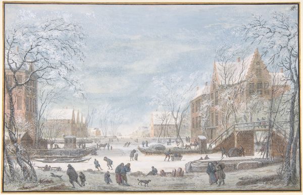 Curator: Frans de Momper, painting in the Dutch Golden Age, brings us "Winter's Day in Breda," executed in oil sometime between 1648 and 1651. What leaps out at you, visually, about this piece? Editor: A quiet desolation. Not bleak, exactly, but subdued. The palette is all creams and browns and muted blues, like a photograph faded with time and cold. I find the architecture is very captivating, too. Curator: That subdued palette really captures the specific atmosphere, doesn't it? Momper wasn't just depicting a winter's day; he was constructing a very deliberate image of Breda. You know, Breda had a very symbolic importance at that time, during and after the Eighty Years' War between the Dutch and the Spanish. Its capture and recapture were key moments. Editor: That explains the slight formality. Despite the genre scene playing out, there's something very staged, like everyone knows they're part of this bigger picture. I imagine a city trying to redefine itself, trying to showcase its... well, perhaps not glory, but resilience. I keep coming back to the snow. It feels like it's acting as a buffer, muting the echoes of conflict. Or perhaps concealing something underneath. Curator: Exactly! It’s a powerful symbol of renewal, or maybe imposed forgetting. The composition emphasizes the town square, the figures within it – some working, others perhaps observing. Momper makes it both intimately familiar and grandly historical, like a freeze frame from the long-running play of Dutch identity. Editor: Identity’s an interesting concept here, isn’t it? Those anonymous figures trudging through the snow— are they Dutch or Spanish? Burghers or vagrants? The snow makes them all equal participants of the same landscape, as if national distinctions mattered less against a shared winter sky. I really find beauty in that ambiguity, somehow. Curator: It's a very balanced presentation, really. Thanks to the realism trend gaining momentum back then. And I also wonder, with our modern lens, if we might not be superimposing too much of our own contemporary anxiety on this genre piece of seemingly normal daily life. It looks so calm here. Editor: Maybe, but isn't that the beauty of it all? How paintings made in other eras may look as mirror to ourselves? Anyway, thank you for shining some new light into this Winter's Day, a piece which, one must agree, is not so bleak as it looks after all. Curator: Indeed. Perspective can shift, much like the winter snow.