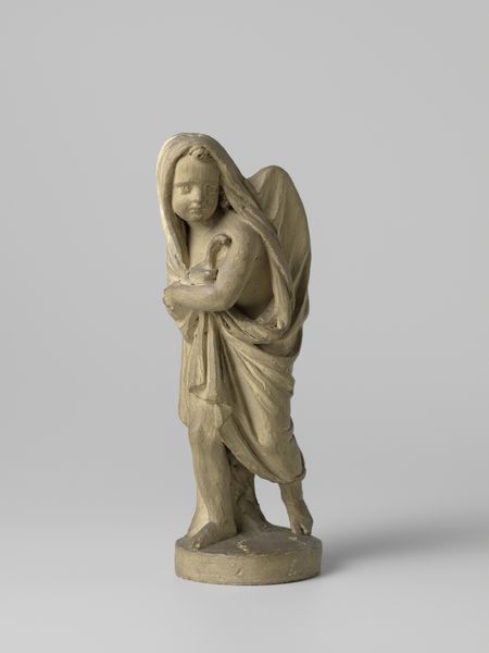 Editor: Here we have "Figure of Red Riding Hood with Basket," made sometime between 1852 and 1858 by the United States Pottery Company. It’s ceramic and so delicately crafted. The overall effect, to me, is one of vulnerability. What strikes you about the visual presentation of this sculpture? Curator: Note how the artist’s employment of pure white heightens the figure’s apparent innocence. Consider the composition; the soft draping of the cloak, and the subtle asymmetry of the basket, placed to the side to maintain the line of sight with the figure. These visual decisions create a quiet drama. Do you perceive a visual contrast between the texture of the basket and that of the cloak? Editor: Yes, the basket’s texture appears coarser, more rigid, while the cloak is smoother. Is that contrast intended to emphasize… something? Curator: The contrast, one might argue, directs the eye to these two vital semiotic components –the functional and narrative. How the solidity of the container speaks to pragmatism within a world of fairy tale. Do you see how the artist creates the rhythm and volume within limited variation, mostly through the subtle play of light across the glazed ceramic surface? Editor: I see now, the lines and shadows define the figure, even though it's all one color. That's clever. Curator: Precisely. And it prompts us to consider the work, not as mere representation, but as a thoughtful construction of form and light. Editor: I hadn’t thought about it that way, focusing more on the story. But seeing the interplay of light and texture adds another dimension to my understanding. Curator: Indeed, shifting our gaze reveals unexpected depths in this seemingly simple sculptural form.