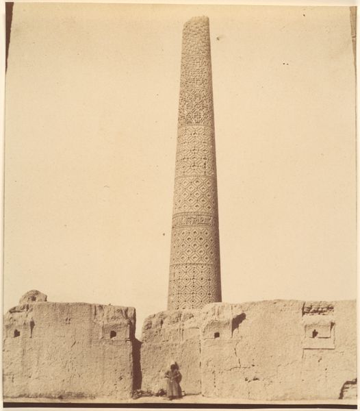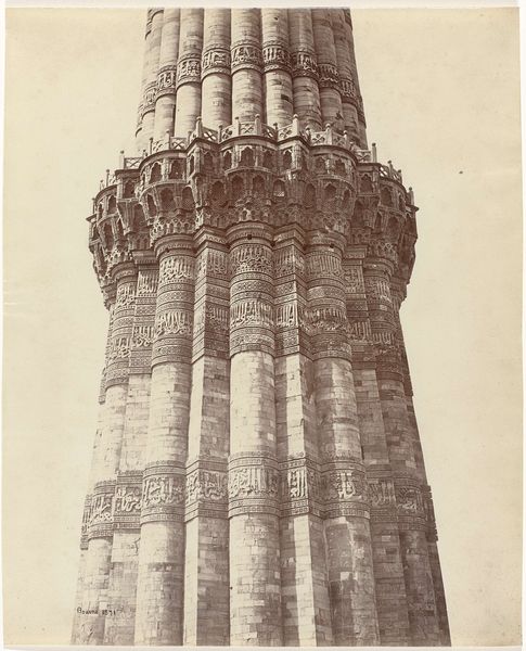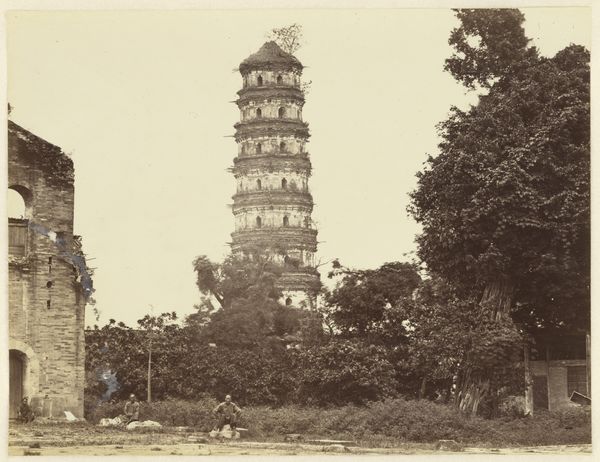 Curator: Looking at this oval albumen print, “A Pagoda near Chao-Chowfu,” taken around 1868 by John Thomson, the overwhelming sensation is one of solidity and permanence. What’s your immediate reaction? Editor: Stark beauty, but also a hint of unease. It’s this looming, almost ominous structure dominating the landscape—reminding me of the long shadow colonialism casts on these spaces and the act of representing them. Curator: Indeed. Consider how Thomson frames the pagoda: each distinct level is articulated with careful precision, creating a sense of ascending harmony. The subdued tones of the albumen print enhance the structural integrity. Editor: Yet, the very act of photographing it through a Western lens brings forth questions. Thomson, a Scottish photographer, captured this during a time of immense power imbalance. This pagoda becomes, in a sense, a trophy or a symbol of exotic conquest, whether intentional or not. How can we reconcile that tension? Curator: By recognizing that tensions are intrinsic to the work. Notice the way Thomson utilizes light—it sculpts the pagoda, emphasizing its geometric form and the subtle variations in texture. The architecture itself becomes the subject. It adheres to specific proportional relationships. Editor: But we can't ignore the context! Think of the role pagodas play in spiritual life and local identity, juxtaposed against the photographer's imperial gaze. This isn't merely a neutral document; it is entangled within a complicated web of power dynamics and orientalist perspectives. Curator: I see your point, but let's not diminish Thomson’s craftsmanship. His manipulation of light, composition, and even the choice of vantage point all contribute to the creation of an iconic image. These visual strategies are quite effective. Editor: Agreed, and exploring how different interpretations can co-exist allows us to address a broader discourse. Thank you. Curator: Absolutely. It reminds us that images from the past speak differently across generations and that we must continue listening with open minds.