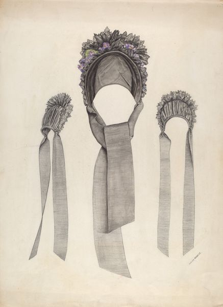 Editor: So, this is Frank Nelson’s “Straw Bonnet,” made around 1938, using watercolor and pencil. It’s such a delicate piece, almost like a memory. How do you interpret this work? Curator: It is striking how a seemingly simple watercolor of a bonnet can reveal so much about the construction of femininity in the 1930s. Consider the cultural weight attached to women's fashion during that period. These were times of economic hardship and shifting gender roles; therefore, even accessories held socio-political meaning. What do you think this level of detail in representing women’s garments and adornments meant in this period? Editor: I guess it speaks to the constraints placed on women, that their identity was so tied to their appearance. Curator: Exactly. The intricate lace and the deliberate placement of the purple ribbons evoke notions of prescribed elegance and the pressures to conform. Nelson’s artistic choice to present the object without a figure can almost represent the absence or erasure of individual female identity. Do you find that there’s also commentary about class embedded here? Editor: That's interesting. I do notice a certain aspiration for upper-class aesthetics, maybe a silent yearning portrayed in the precise rendering. Curator: It brings into question accessibility, who can even afford something like this. Perhaps Nelson, with this careful artwork, directs our gaze to consider this very tension, in this historical snapshot. Editor: I never considered how much a seemingly innocent depiction of fashion could tell us. It makes me wonder how much art can actually speak about gender and class constructs. Curator: And that questioning is the very beginning of understanding the true power of art as an activist instrument.
