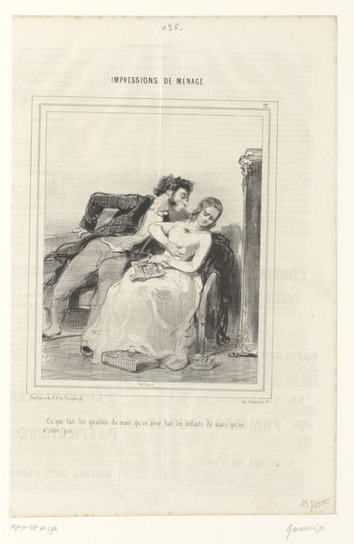 This print by Paul Gavarni, whose dates span from 1804 to 1866, depicts a young woman tending to a young man's hair. Consider the era in which Gavarni lived, a time when social roles were rigidly defined, particularly those of gender. This piece, through its intimate portrayal, challenges such norms. The young man sits passively as the woman attends to him, a reversal of traditional gender dynamics. The tenderness in the woman's gesture evokes a sense of care and domesticity. Yet, there's a tension, isn't there? Is this an act of love, a gentle subversion, or a commentary on the changing roles within relationships? What might the 'martyrs' in the print series' title suggest about the dynamic between the figures? This image asks us to consider the personal within the political, inviting us to reflect on the emotional negotiations within relationships and the subtle ways individuals can challenge or reinforce societal expectations.