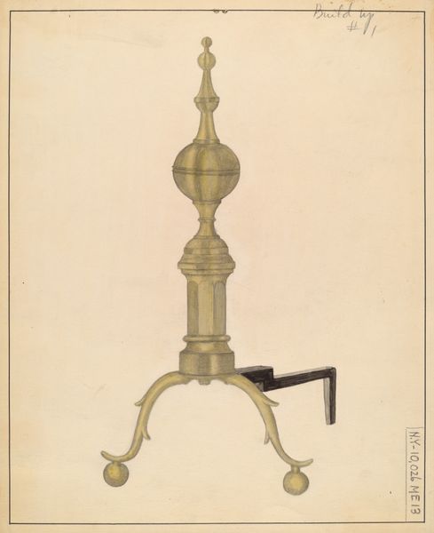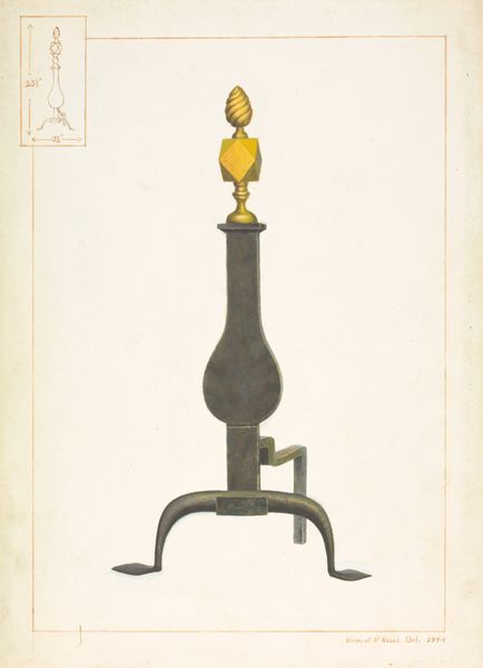 This drawing of an andiron, one of a pair, was made by Hans Korsch, using what looks like graphite and colored pencil on paper. Look how the colors are laid down in very small hatched lines, almost like a pointillist painting, but with a real attention to form. You know, the way the light glances off rounded surfaces. The drawing itself is so precise, so focused on the material qualities of this object. The slightly metallic sheen, the weight of it, the sense of it being both functional and decorative. Notice how the artist has really thought about texture, about the way the light would catch on the metal. And there's something about the almost obsessive detail, the evenness of the application, that lends a kind of quiet intensity to the piece. It reminds me a little of the drawings of Vija Celmins, you know, where she painstakingly recreates found objects. Both artists use the act of drawing as a form of meditation, a way of really seeing, and understanding the world around them. It’s a reminder that art isn't just about grand gestures; it's about close looking and quiet, careful work.