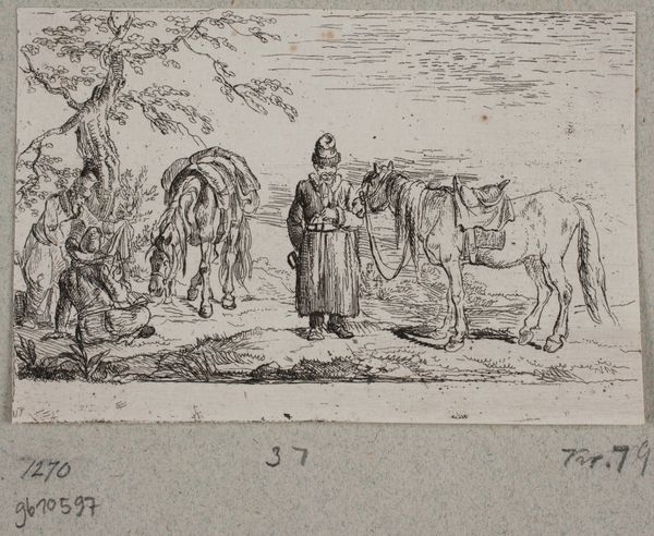 Curator: Here we have Lorenz Frølich’s “Illustration til Adam Oehlenschlägers digt "De to kirketårne"”, an engraving dating to 1844. What’s your initial read? Editor: Stark and strangely unsettling. The line work is delicate, but the figures, particularly the armored man and woman clasped hand-in-hand, feel like figures of power on the brink of something tumultuous. Curator: I see it. Frølich really captures a tension between the domestic and the heroic, wouldn’t you say? The church with the stork on top as this almost fairytale backdrop juxtaposed with the weight of armor. It’s quite evocative. The dog to the lower left is definitely symbolic. Editor: Precisely. The artist subtly interweaves societal binaries that were taking shape during this historical moment, notably through costuming and positioning, with the church appearing more domestic than divine—a signal about cultural changes in the era. But this power dynamic has an uncomfortable undercurrent that's further emphasized by the church in the background. There seems to be a critique about established powers too. Curator: Intriguing idea! Perhaps there is also something to say about Frølich as an illustrator responding to Oehlenschläger, translating poetic allegories of national identity into very distinct visual terms. Frølich brings forth a very particular kind of Northern romanticism... almost melancholy... from Oehlenschläger’s verses. Editor: Absolutely. The very specific, recognizable historical markers used for landscape, architecture, clothing… This can also tell us how images are circulated and consumed during the period. This period relied heavily on engravings. Curator: Yes. The sketch quality reminds us of the preparatory work, and there's also the bird flying on the background too. This feels very delicate. A stark contrast, again, with that heavy armor! The entire image operates through that visual opposition. Editor: Overall, the tension, as you call it, makes this more than just an illustration. The image resonates with enduring anxieties around cultural identity. Curator: An engaging piece indeed; thank you for adding such interesting considerations. Editor: Thank you; always insightful.