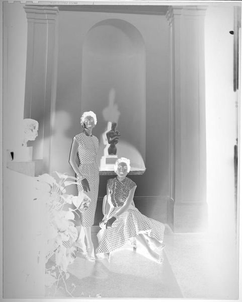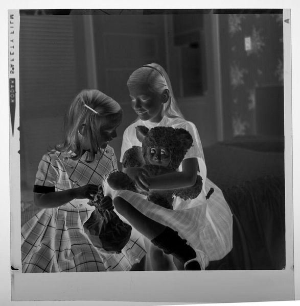 Curator: Before us is an untitled photograph by Martin Schweig, depicting a young girl and boy seated on an ottoman. Editor: It’s a striking image, almost ghostly, with the high contrast giving it an ethereal quality. The children seem suspended between worlds. Curator: Indeed. Note the composition; the verticality of the curtain backdrop emphasizes the subjects' posed stillness. The light plays across the surfaces, highlighting texture. Editor: And the dog beneath the ottoman—an almost hidden presence. I wonder about the societal expectations placed on these children, the performance of innocence captured here. Curator: The formal arrangement suggests a carefully constructed narrative, a tableau of childhood, while the technical process lends it a certain detached objectivity. Editor: Perhaps, but the image also evokes a sense of vulnerability. Their postures, the dog's hidden position—they hint at deeper emotional complexities within the frame. Curator: An interesting perspective. The photograph's starkness invites multiple interpretations, a testament to its evocative power. Editor: It definitely makes you question what stories lie beneath the surface of such seemingly simple portrayals.