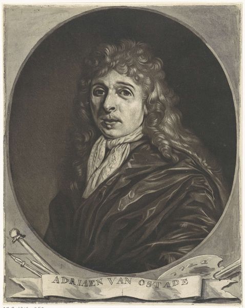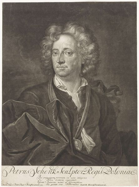 Curator: We're looking at an artwork by Pieter Schenk, who portrayed himself in this self-portrait executed between 1697 and 1713. This particular piece is an engraving and resides in the esteemed collection of the Rijksmuseum. Editor: Immediately, I'm struck by the contrast! The use of light and shadow is superb, creating a sense of depth despite the medium. And there’s this almost theatrical quality, an implied narrative. Curator: Indeed! Consider the period; this engraving emerges during the Dutch Golden Age, a time where portraiture, even self-portraiture, often served specific functions related to constructing identity and securing patronage. His gaze, directed at the viewer, makes this an act of self-promotion within specific networks. The artist presenting himself through calculated artistic gestures to promote his artistic skill and elevated societal position. Editor: But look closer: the fine lines, the details in the hair, the subtle gradation of tone. It draws the eye inward. Also, there is this heavy reliance on tonal contrasts, a sophisticated technique that emphasizes the volume and texture of the garments and, naturally, of Schenk's features. Curator: And we must also think about how he represented himself within the framework of gender and status expectations. Think about that neckwear for instance, what is that communicating, considering his profession? The subtle presentation is a performance of a man conscious of how others perceived him and wanting to communicate something to his audience. Editor: You raise a fair point, but without necessarily considering the context, I find myself appreciating how Schenk manages to capture, with such limited means, a real sense of flesh and blood—a human presence beyond the symbols of status. Curator: By understanding this in a more encompassing context, we can go beyond his mastery of engraving, delving deeper into self-fashioning as a political action during a transitional time in art history, where one’s art also acted as your calling card and proof of existence. It highlights the complex negotiations of self-presentation for artists during that era. Editor: So, by merging your sociocultural assessment and my close inspection of form, a deeper reading is made, enhancing this beautiful work as a key artefact in understanding society itself. Curator: Precisely! It becomes more than a self-portrait—it’s an engraving, but moreover a reflection of identity within its period and location!