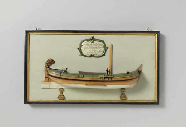 This half-model of an Amsterdam war frigate was crafted by Charles Bentam, using wood, metal, and paint. The materiality of the model speaks to the broader context of maritime power and trade. Notice how the wooden hull is carefully shaped, a testament to both the skill of the model maker and the shipbuilding traditions of the time. The weight and density of the wood convey the sense of a vessel designed for both transportation and naval force. The dark, sleek paint job, combined with touches of metal, emphasizes its capacity for both function and warfare. Making this model involved a highly skilled process, demonstrating an understanding of shipbuilding techniques and naval architecture. This wasn't just an artistic endeavor; it was a representation of Dutch maritime dominance, a testament to the labor, resources, and technological prowess of the time. Thinking about how this model was made – the materials used, the processes involved – sheds light on the broader social and cultural significance of shipbuilding and trade in Amsterdam. It challenges our conventional notions of fine art, showing us how craft and design were deeply intertwined with power, politics, and commerce.