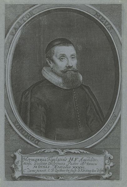 Crispijn van den Queborn created this portrait of Hermannus Tegularius with engraving techniques. The composition is structured around an oval frame, which immediately draws the eye to the subject. Note how the fine lines of the engraving create texture and depth, especially in the rendering of the face, beard, and elaborate collar. The contrast between light and shadow gives the portrait a sense of volume and presence. Beyond mere representation, this portrait engages with the semiotics of status and identity. The subject's clothing and the detailed inscription below serve as signs that communicate his position and accomplishments. Queborn’s expert manipulation of line and form elevates the work beyond a simple likeness, inviting viewers to decode the complex layers of meaning embedded within its structure. Ultimately, it is a fascinating interplay of form and content.