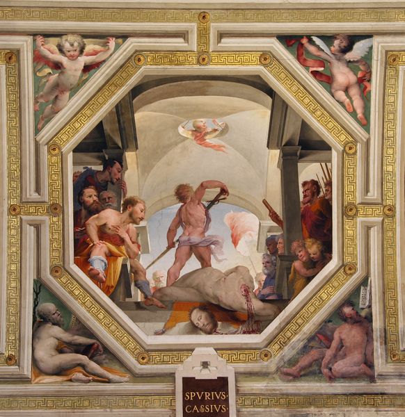 Curator: Francesco Salviati painted this scene titled "Camillo Punishes the Treacherous Teacher from Falerii" in 1545, using oil paint, or perhaps fresco, depending on the specific location. Editor: My first thought? Carnage served with a side of elaborate fruit platters! It’s like a Renaissance smackdown with the Rockefellers catering. The composition feels dynamic, with bodies twisting in the foreground. It really catches the eye. Curator: Indeed, the Mannerist style is quite apparent, evident in the elongated figures and stylized gestures that heighten the dramatic effect. Structurally, the fresco can be decoded through semiotic analysis of classical virtue being favored, even championed. Editor: Okay, now you’ve officially activated my artist brain. Imagine being that teacher! Utterly shamed in public, and he probably thought he was so clever. Salviati has brilliantly captured the essence of that exposed nerve feeling through this teacher's pathetic stature. The colors add a layer of emotionality. It's somber yet grandiose! Curator: Consider too, the role of space in the painting’s rhetoric. The artist uses the compressed perspective of a staged, landscape backdrop to amplify the allegorical lesson on Roman values. What’s curious to me is the anachronistic nature of the armour and the very present urban depiction within the overall painting. Editor: Right, the figures seem to occupy an elevated mental space, perhaps not too far from the dreamlike experience we viewers get when looking at them. As for Roman virtue, yes, a brutal spectacle delivering an important message; I reckon some may consider it necessary, others just cruel! Curator: That divergence is, of course, crucial in evaluating this artwork and its period. These are important nuances and tensions that render this painting, as we examine the construction of early Renaissance painting, infinitely compelling, and indeed thought-provoking. Editor: Absolutely! Now if only the Renaissance paparazzi had Instagram; this moment deserved to go viral. It’s so satisfying getting lost in a world crafted so beautifully with its human drama laid bare like that.