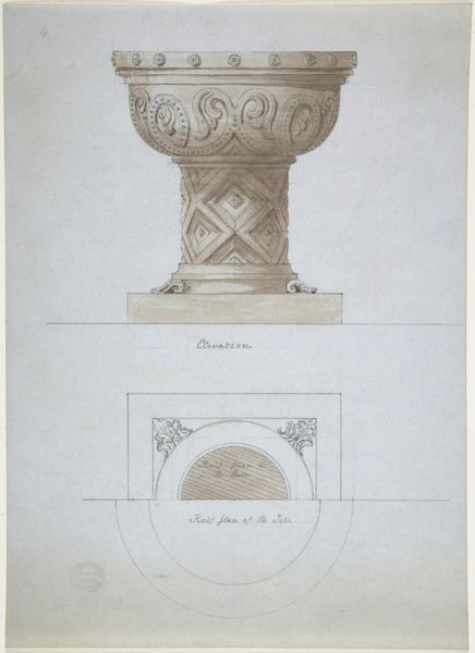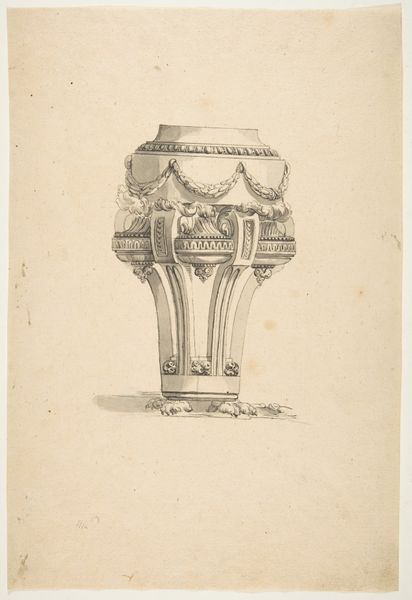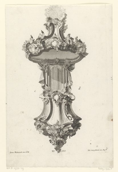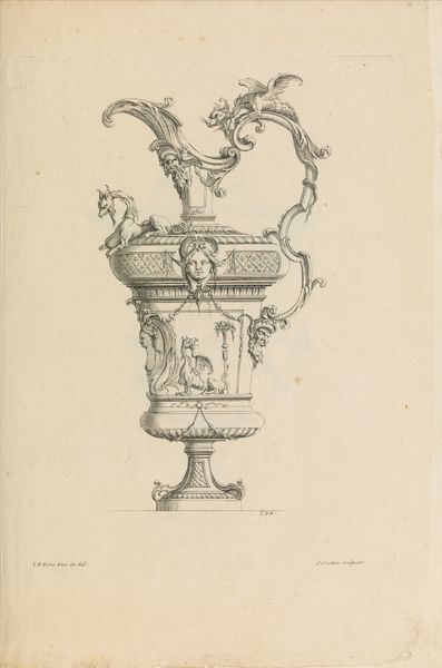 Curator: This print is from Jean Bernard Toro's "Nouveau Livre de Vases," dating back to 1716. Editor: Wow, it’s incredibly ornate! It feels very self-important. All those flourishes and sculpted figures—very Baroque, wouldn't you say? Curator: Precisely. Toro, as a designer, was deeply involved in the artistic output during the reign of Louis XIV. This print would likely have served as a template, part of a broader movement where art became increasingly reproducible and circulated as commodity. Think about how this changed artisan training. Editor: And the potential shift in societal values it represents! Reproducibility allows a wider distribution of idealized status symbols like this vase. The vase isn't just an object, it becomes a vector propagating values centered on opulence and courtly life, potentially influencing aspirational class identities. Curator: Right. Vases, often crafted from luxury materials such as marble, would serve an important social function for displaying wealth. But these designs also influenced less expensive ceramics, accessible to more of the population. Editor: I'm wondering about the power dynamics implicit in this design. A portrait seems to be carved into the side—who decides who gets commemorated like that? Was this circulated amongst specific social echelons? Is it also reproducing a certain ideal of beauty? The power to control the narrative feels strong here. Curator: The material aspect informs this too. The precision needed for prints required skilled engravers and access to specific tools and inks, limiting the creation process to educated members of craft guilds working on the "Royal Imprimerie". Editor: That focus on material accessibility is crucial in examining the wider social impact. Considering this from multiple perspectives deepens my understanding—thank you for elucidating the significance of what might seem like mere decorativeness! Curator: Thank you! There's a rich interplay here, with design innovations influencing artistic traditions, and, ultimately, shifting our cultural landscapes.
