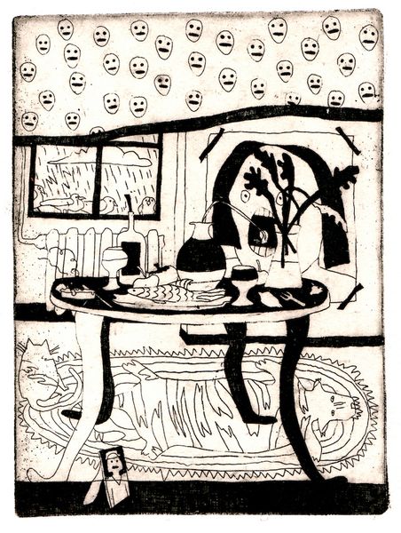 Editor: So, this is "#15: El Alambique (The Still)" from 2008 by Marina Pallares. It has this really striking, almost old-fashioned stamp-like feel with its heavy lines and stark contrast. What jumps out to you when you look at this, with its mysterious equipment depicted? Curator: Ah, yes! It whispers of hidden practices and secrets! Instantly, I’m drawn to the boldness of the linework. Each line seems purposeful, digging deep, defining form while simultaneously adding an element of delightful chaos. And it reminds me, oddly enough, of trying to decipher my grandmother’s cryptic cooking instructions - a beautiful tension between precision and, well, a splash of artistic madness. Does the word "Alambique" trigger any thoughts for you? Editor: It kind of sounds like "alchemy"... Does it have anything to do with that? Curator: Precisely! The alambique *is* a still. Consider the transformation central to alchemy. Base metals into gold, mundane existence into, perhaps, artistic brilliance? Pallares’s work invites us to reflect on those hidden processes in life – the pressures and heat that transform us. Is that table offering support...or something more? Editor: Hmm... It's true that the patterned surface beneath seems like a shaky foundation for such precise equipment. I like the idea of it representing the chaos that gives rise to order. I hadn't really considered that it may be more than just equipment. Curator: And is "15" of significance do you think? Each viewer, with their singular memories, completes this evocative picture. Art, at its best, isn’t a lecture. Rather it is that whispered "Perhaps?" in your ear. Editor: That's so true, you see a painting differently each time depending on what you're thinking about! I think I will now whenever I look at this.