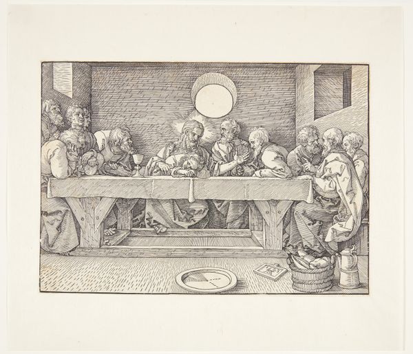 This print on laid paper, titled The Last Supper, is by an anonymous artist. Images of the Last Supper were common in the early modern period, often commissioned for institutional settings such as monastery refectories. Here, in the absence of a known artist, the interpretation becomes all the more dependent on the viewer. The scene depicts Jesus's final meal with his apostles before his crucifixion. The composition emphasizes the emotional tension and uncertainty among the apostles. The print's visual codes include the halo above Jesus, as well as the symbolic foods on the table and a sense of spatial depth achieved through linear perspective. These elements invite viewers to contemplate the religious and social significance of the event. Analyzing it requires understanding not only the biblical narrative but also the cultural and institutional contexts in which such images were circulated and consumed. Considering its function within religious institutions can help us grasp its intended meaning and impact.