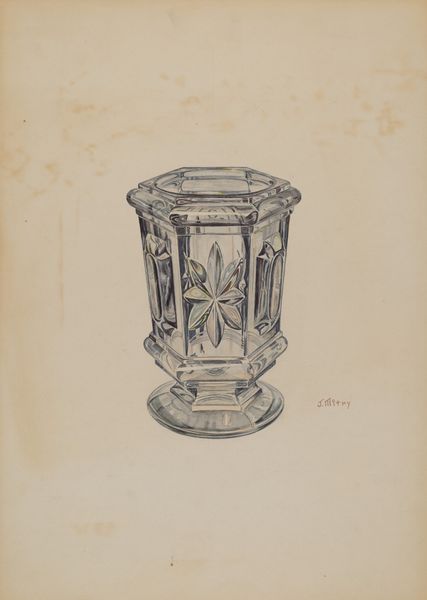 Curator: Take a look at "Stand for Baptismal Font," created in 1937 by Edward Jewett, rendered in watercolor on paper. What's your first reaction? Editor: There's a certain starkness to it. Despite the ornamentation and soft colors, it feels quite austere, almost desolate. Curator: It's interesting you say that. Consider the context of baptism itself – a ritual of purification and rebirth, but also a recognition of past failings. Jewett’s piece subtly communicates this complex intersection. Editor: The artist clearly employs some interesting formal elements, from its square pedestal to the softened concave elements on each side of the structure. This provides some balance to the structure. Curator: Absolutely. The geometric stability combined with those flowing, almost organic lines of the ornamentation... It presents an interesting visual dialectic. But what stands out for me is its relationship to ecclesiastical power structures. Who gets baptised and on what basis? Editor: While I can appreciate the potential symbolic meaning, let's not forget the literal surface of this stand. The interplay of light and shadow, subtly rendered in watercolor, imbues the otherwise cold geometry with warmth and texture. Curator: But is it warmth, or merely an aesthetic illusion? The cracked and worn effect he depicts can be interpreted as a critique of institutions claiming timeless perfection, while, in fact, being subjected to the ravages of time and social change. Editor: That reading definitely colors how I see those details. I was initially drawn to the play of color. Curator: Color, indeed, plays a critical role. The muted palette, bordering on monochrome, underscores a certain seriousness, perhaps reflecting the weighty symbolism of the ritual it supports. It also may hint to racialized aspects of this faith, where black liberation and salvation occur through immersion in holy water. Editor: I find I am much more interested in how the star emblems draw your eyes, yet are faded with time. Curator: On reflecting, our observations, though contrasting, only underscore the layered experience this artwork can provide. Editor: Indeed, there’s always more to unpack. This visual dialogue illuminates that tension.