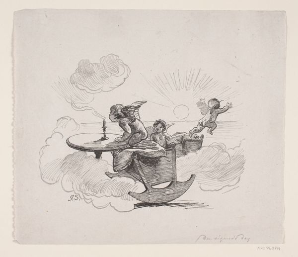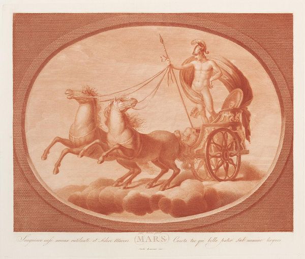 Editor: Here we have Conte Carlo Lasinio's "Saturn," a reddish-brown print residing in the Harvard Art Museums. I'm struck by the unusual pairing of Saturn with that dragon-like creature. What are your thoughts on its symbolic significance? Curator: The image draws upon a deep well of cultural memory. Saturn, often depicted with a scythe, symbolizes time and its relentless passage, sometimes associated with melancholy. The dragon, a composite creature of primal energy, hints at chaos. Editor: So, it's a visual representation of order versus chaos? Curator: Perhaps. Or the cyclical nature of destruction and rebirth. The pairing urges us to contemplate not just time’s passage, but the emotional weight of its impact on the psyche. It's a stark reminder of mortality, but also resilience. Editor: I'm finding that contrast fascinating. It gives me a lot to think about. Curator: Precisely. The enduring power of symbols lies in their capacity for multiple interpretations across generations.